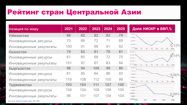 Таджикистан, занявший 108-е место, отстает по обоим направлениям одновременно — и по ресурсам (105-е место), и по результатам (104-е место). Общей для всего региона остается критически важная проблема: доля инвестиций в НИОКР в ВВП стран Центральной Азии остается в десятки раз меньше, чем у мировых лидеров, где этот показатель достигает 2–4%. Таким образом, ключевая задача на ближайшую перспективу заключается не только в наращивании ресурсной базы, но и в создании эффективных механизмов, которые позволят превращать этот потенциал в конкретные результаты, способные изменить траекторию экономического развития.