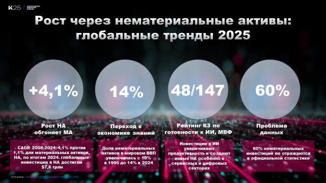 Мы становимся свидетелями фундаментального перехода — от экономики, основанной на материальных активах, к экономике знаний, где решающую роль начинают играть активы нематериальные. Именно они демонстрируют ошеломляющую динамику, растя в четыре раза быстрее своих материальных аналогов. По итогам 2024 года общий объем глобальных инвестиций в эту сферу достиг около 8 триллионов долларов, причем свыше половины этой суммы — 4,7 триллиона — приходится на США. За последние двадцать лет доля нематериальных активов в мировом ВВП уверенно выросла с 10% до 14%, подтверждая структурный сдвиг в мировой экономике.