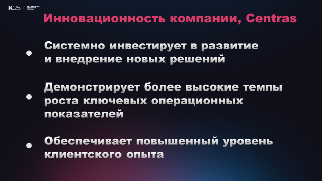 Для «Сентрас» инновационная компания — это не просто организация, внедряющая отдельные технологические решения. Это, прежде всего, бизнес, который ведет системную и последовательную инвестиционную политику, направляя ресурсы в три ключевых направления: научные исследования и разработки (НИОКР), программное обеспечение и другие нематериальные активы (НА). Такие компании не просто следуют за рынком — они последовательно опережают его по динамике ключевых показателей. А главное, они создают для клиента уникальный опыт, достигая этого не за счет бездумного увеличения затрат, а благодаря исключительно эффективному и осмысленному использованию всех доступных ресурсов.