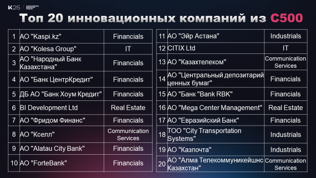 В рейтинге двадцати самых инновационных компаний С500 оказались игроки из самых разных секторов экономики — от финансов и IT до строительства, телекоммуникаций, транспорта и логистики. Примечательно, что среди лидеров представлены как частные, так и государственные компании, что наглядно доказывает: инновации — это вопрос не формы собственности, а стратегического выбора и управленческой культуры.