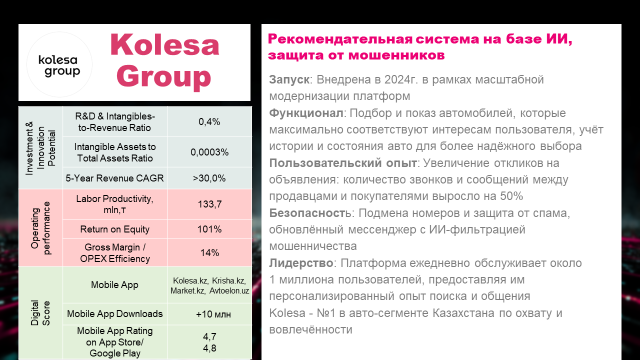 Её рост обусловлен не просто расширением, а последовательными технологическими обновлениями и развитием платформенных решений. Показатели операционной эффективности красноречиво свидетельствуют: платформа не только привлекает огромный трафик, но и научилась блестяще его монетизировать, демонстрируя высокую отдачу на капитал. Наш Digital Score подтверждает силу её бренда и исключительную вовлеченность пользователей. Одним из ключевых факторов успеха стало внедрение рекомендательной системы на бази искусственного интеллекта, которая кардинально изменила подбор и показ автомобилей. Это решение привело к впечатляющим результатам: количество звонков и сообщений между пользователями выросло на 50%, создавая более живой и активный рынок, при этом существенно снизив риски мошенничества. Это яркий пример того, как технология не просто оптимизирует процессы, а качественно меняет саму природу взаимодействия между людьми.
