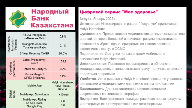 Таким образом, Народный Банк Казахстана демонстрирует работающую формулу успеха: именно интеграция инноваций, цифровых сервисов и нематериальных активов создаёт то самое устойчивое лидерство, которое позволяет не просто адаптироваться к изменениям, а задавать новые стандарты для всей отрасли.
