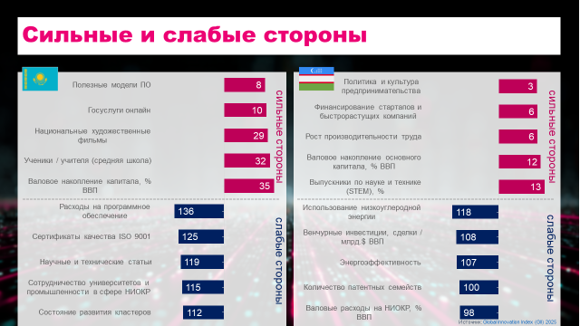 Анализ сильных и слабых сторон двух ведущих экономик Центральной Азии — Казахстана и Узбекистана — выявляет любопытную асимметрию. Казахстан демонстрирует впечатляющий результат в сфере цифровизации, занимая 10-е место в мировом рейтинге по развитию онлайн-госуслуг. Однако эта прогрессивная цифровая инфраструктура контрастирует со слабой коммерциализацией науки: страна находится на 115-м месте по взаимодействию университетов и бизнеса и на одном из последних мест в мире (136-е из 139) по затратам на программное обеспечение.