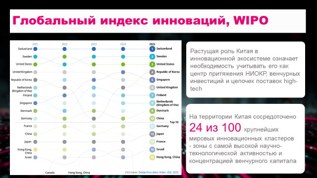Недавно опубликованный глобальный индекс инноваций от Всемирной организации интеллектуальной собственности служит своеобразным барометром, измеряющим научно-технологический пульс 139 экономик мира. Эта комплексная система оценки, охватывающая около 80 индикаторов — от качества человеческого капитала и инфраструктуры до зрелости бизнес-среды и результатов интеллектуальной деятельности, — позволяет увидеть четкую картину глобального перераспределения инновационных сил.