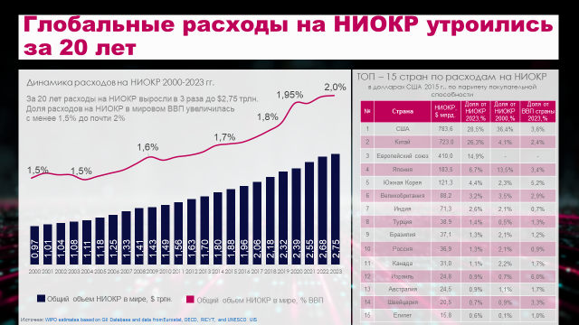 За последние два десятилетия, несмотря на череду кризисов, пандемию и постоянную геополитическую турбулентность, мир демонстрирует удивительную тенденцию: глобальные расходы на исследования и разработки (НИОКР) утроились — с 1 триллиона долларов в 2000 году до почти 3 триллионов сегодня. Но что еще важнее, доля этих инвестиций в мировом ВВП увеличилась с скромных 1,5% до почти 2%. Это означает, что даже на фоне растущей глобальной экономики компании и государства вкладываются в будущее опережающими темпами, признавая НИОКР стратегическим приоритетом.