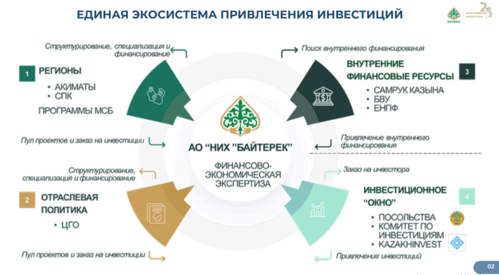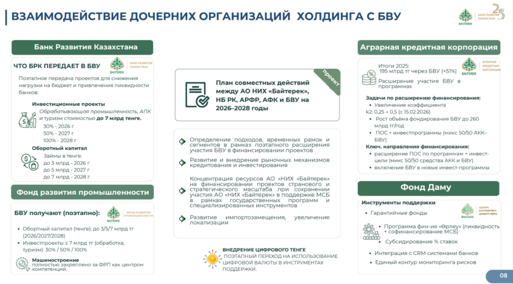 - Реализация совместных проектов, где доля участия БРК может быть минимальной (в качестве примера приводились кейсы, где доля БРК составляет лишь 100 млрд тенге при общем объеме финансирования свыше триллиона).