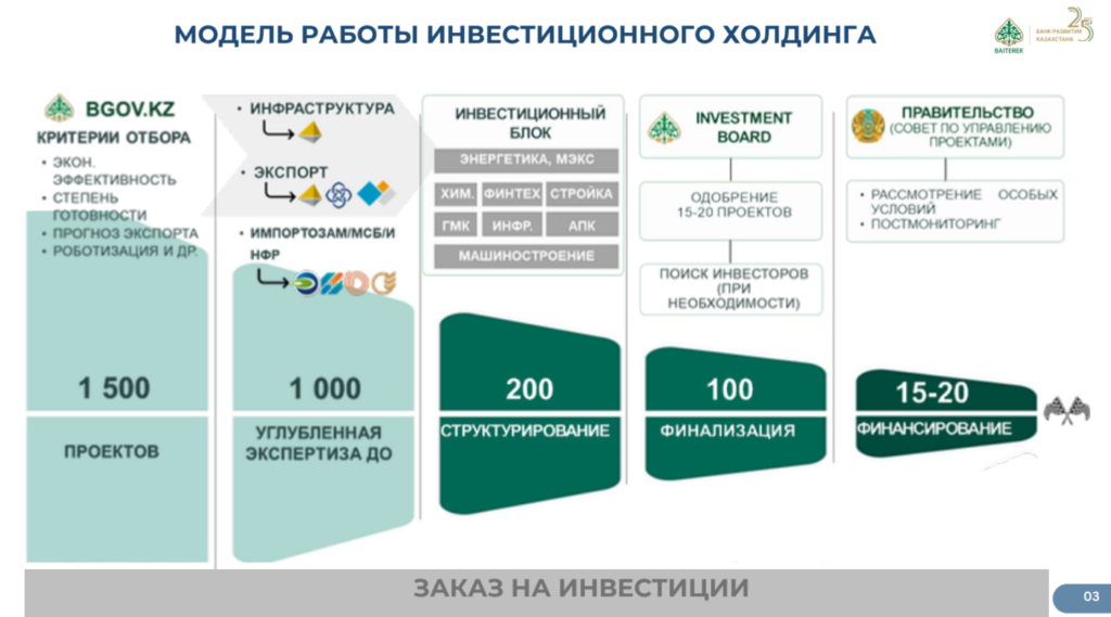 Марат Елибаев уточнил, что проекты стоимостью до 7 млрд тенге будут курироваться банками второго уровня и фондом «Даму», тогда как холдинг сосредоточится на крупных инициативах свыше 7 млрд тенге.