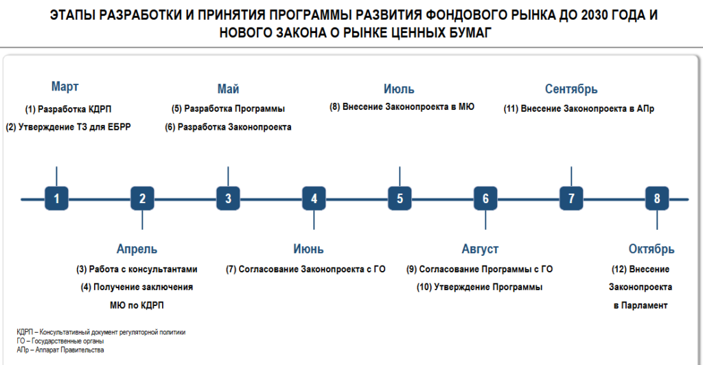 Для реализации этой стратегии АРРФР совместно с Национальным Банком приступает к разработке Программы развития фондового рынка до 2030 года и абсолютно нового профильного закона.