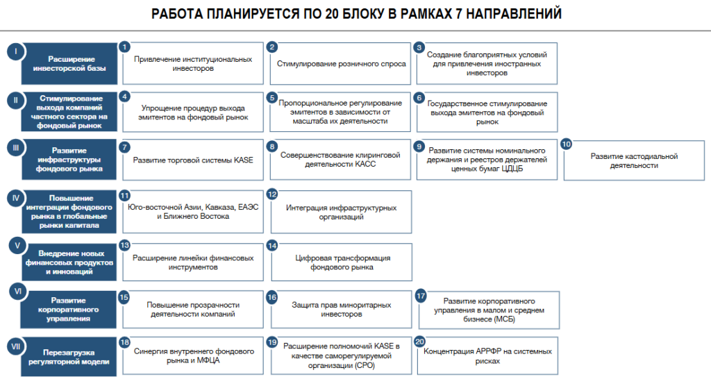 - Стимулирование выхода частного сектора на биржу: Ликвидация дисбаланса между банковским кредитованием и фондовым рынком. Планируется внедрение «единого окна», цифровизация эмиссии и передача регистрации ценных бумаг в Центральный депозитарий.