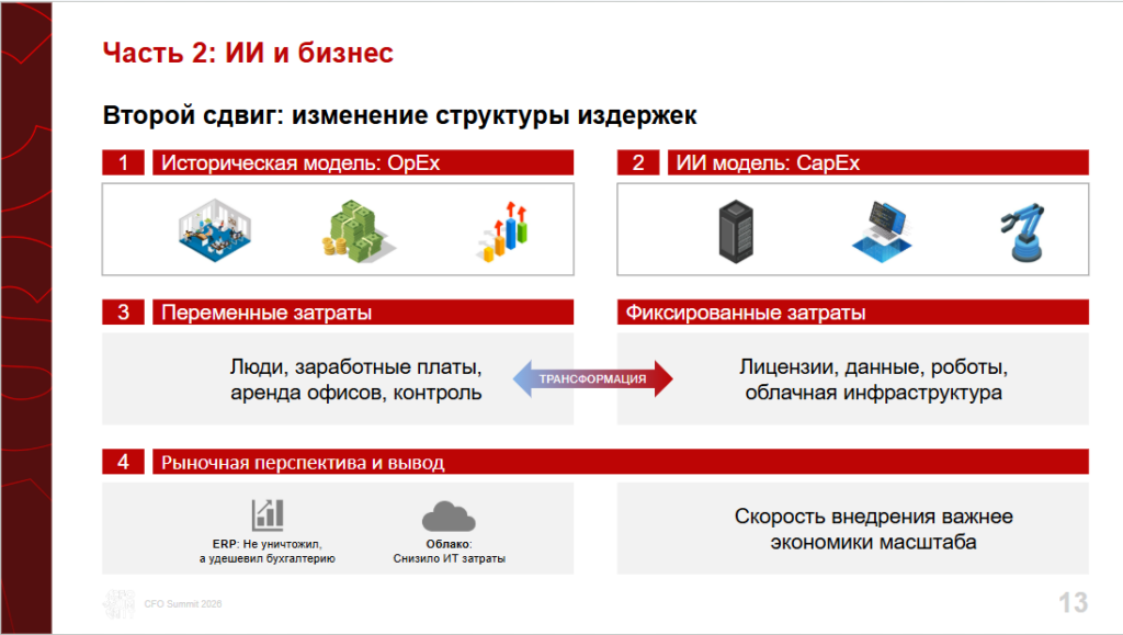 - От OPEX к CAPEX: Традиционно зарплата сотрудников — это операционные расходы (OPEX). Но внедрение ИИ — это покупка софта и мощностей, то есть капитальные затраты (CAPEX).