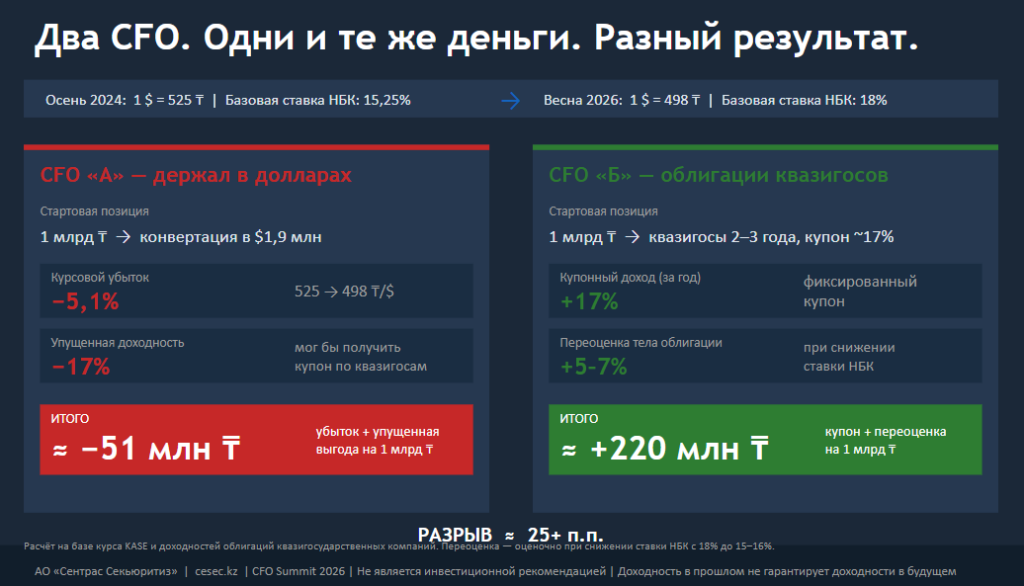 - CFO «А» сделал ставку на покупку валюты по курсу 320, ожидая роста. К февралю 2026 года тенге укрепился, и результат оказался отрицательным: -5,1% годовых плюс упущенная выгода.