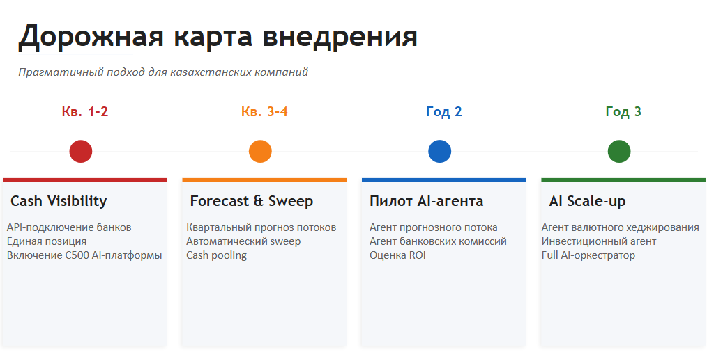 Год 2: Запуск пилота AI-агента для прогнозирования денежных потоков.