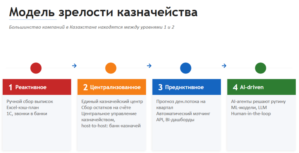 Путь к современному казначейству это эволюция технологий. Спикер выделил четыре этапа, отметив, что на уровне продвинутой аналитики в Казахстане пока работают единицы: